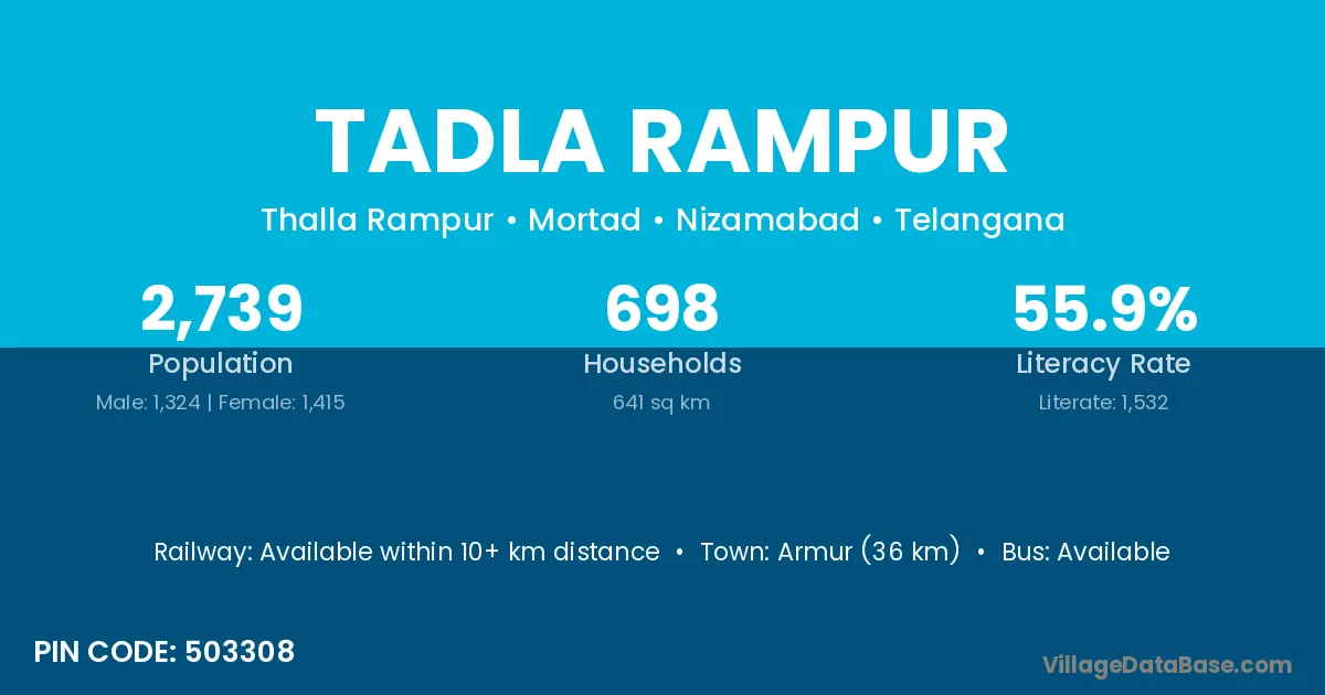 Armur (36 km) is the nearest town to Tadla Rampur village for major economic activities and is located approximately 36 km away.