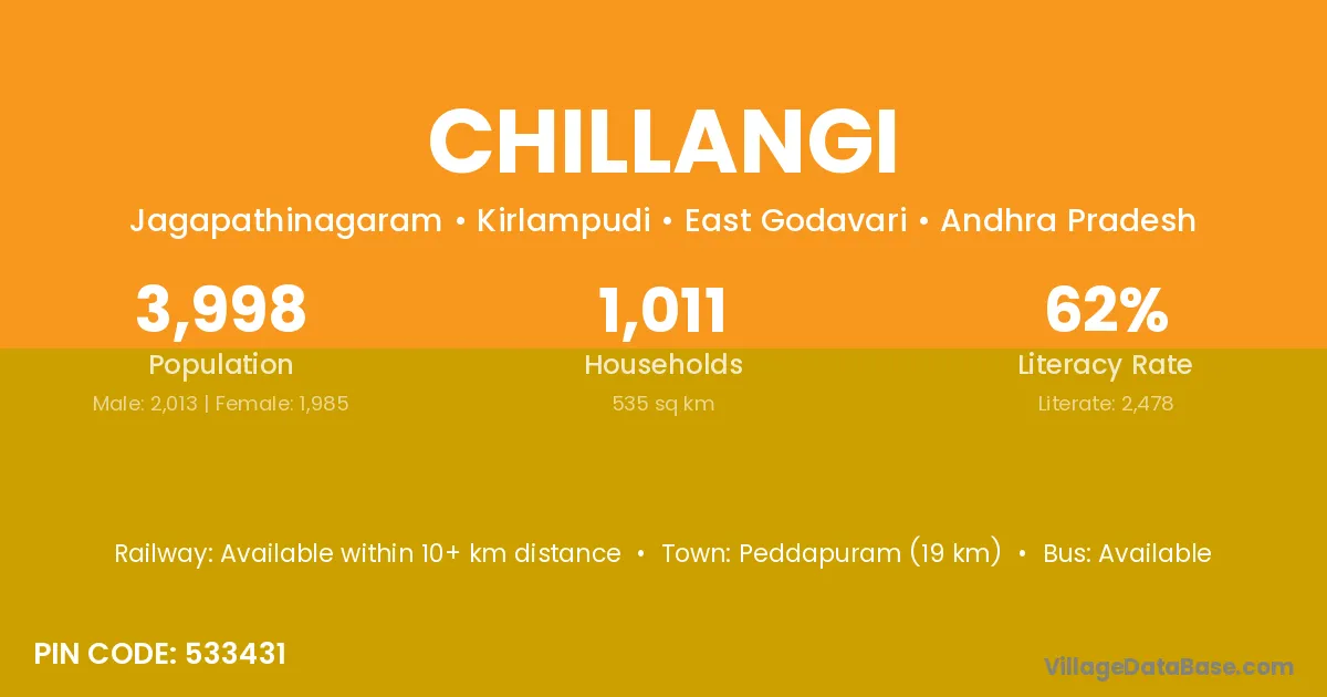 The literacy rate of Chillangi village is 39.93%. Male literacy stands at 48.84% and female literacy at 31.72%.
