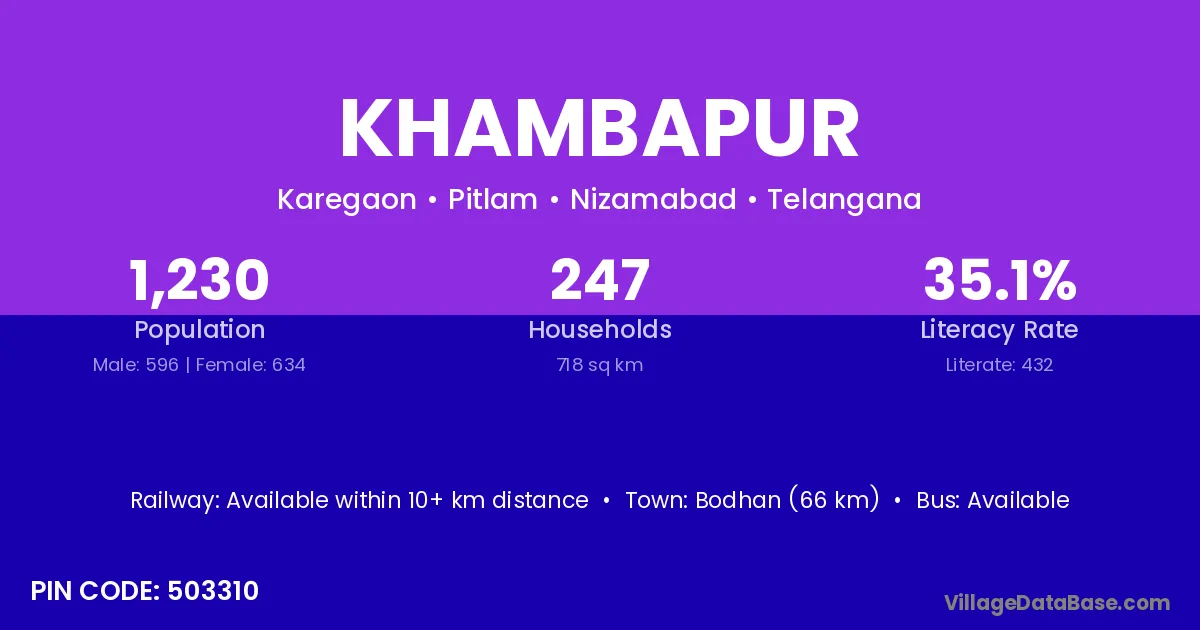 Bodhan (66 km) is the nearest town to Khambapur village for major economic activities and is located approximately 66 km away.
