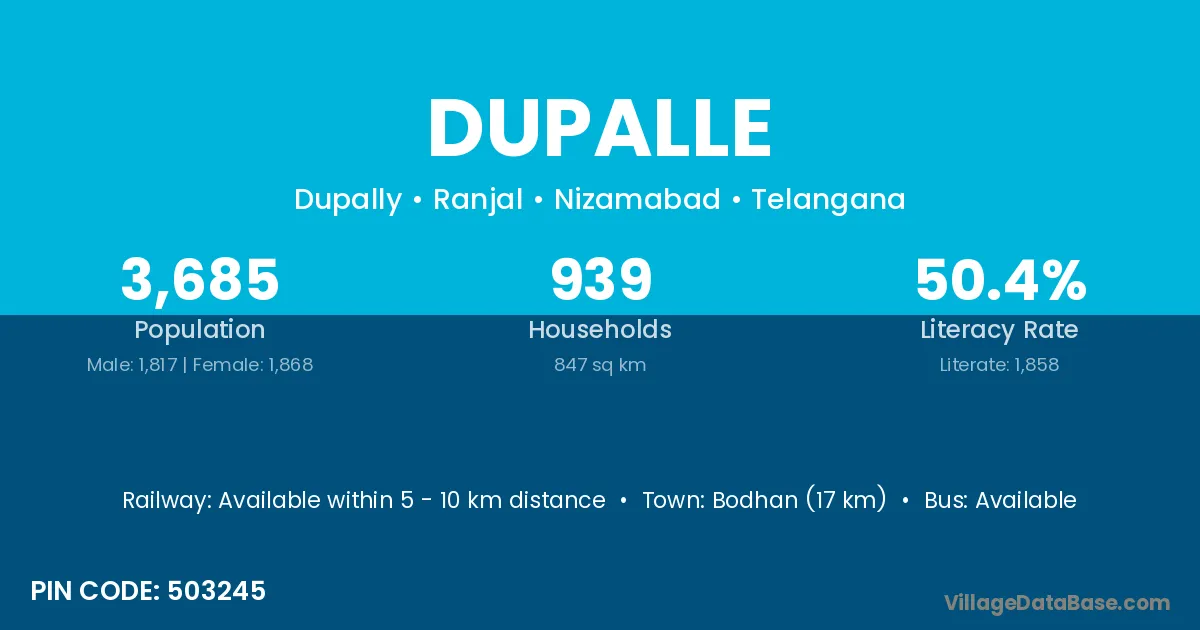 Bodhan (17 km) is the nearest town to Dupalle village for major economic activities and is located approximately 17 km away.