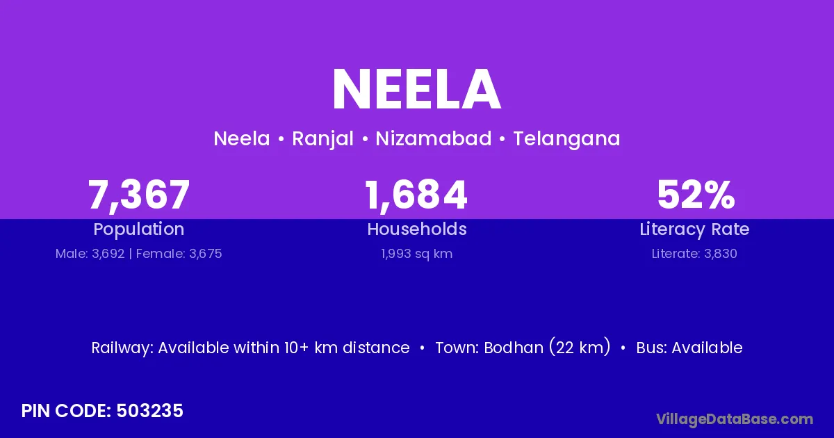 Bodhan (22 km) is the nearest town to Neela village for major economic activities and is located approximately 22 km away.