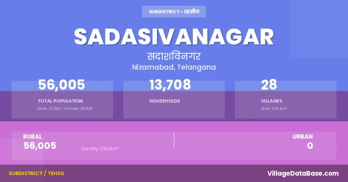 Sadasivanagar is a town and Mandal in the Nizamabad district of the Telangana. In India, a Mandal is a subdivision of a district responsible for the administration and revenue collection of a specific area within the district. Mandals play a crucial role in the local governance structure, contributing significantly to the development and administration of their communities.