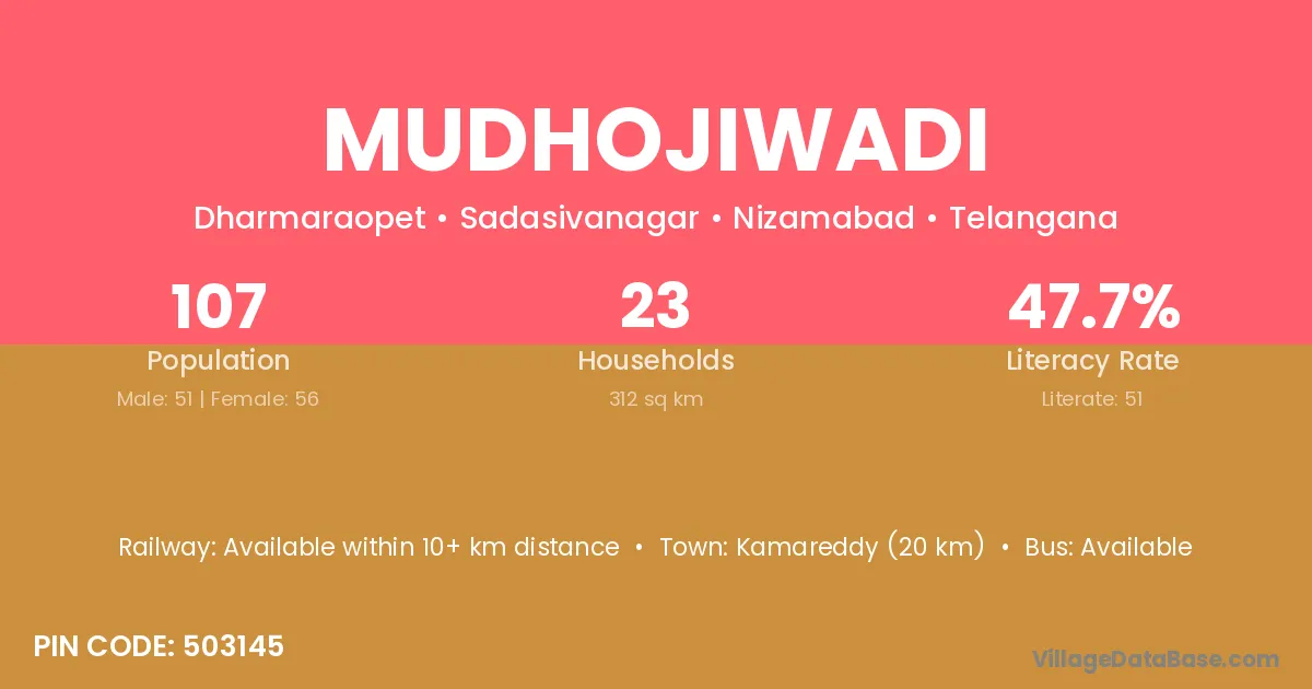 Kamareddy (20 km) is the nearest town to Mudhojiwadi village for major economic activities and is located approximately 20 km away.