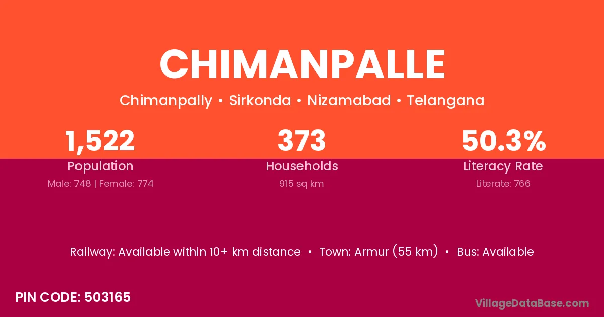 Armur (55 km) is the nearest town to Chimanpalle village for major economic activities and is located approximately 55 km away.
