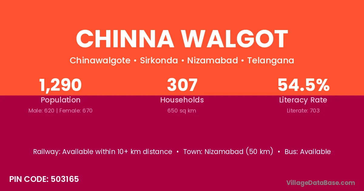 Nizamabad (50 km) is the nearest town to Chinna Walgot village for major economic activities and is located approximately 50 km away.