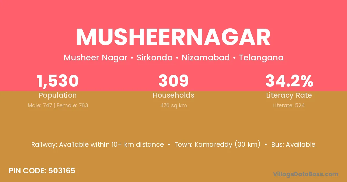 Kamareddy (30 km) is the nearest town to Musheernagar village for major economic activities and is located approximately 30 km away.