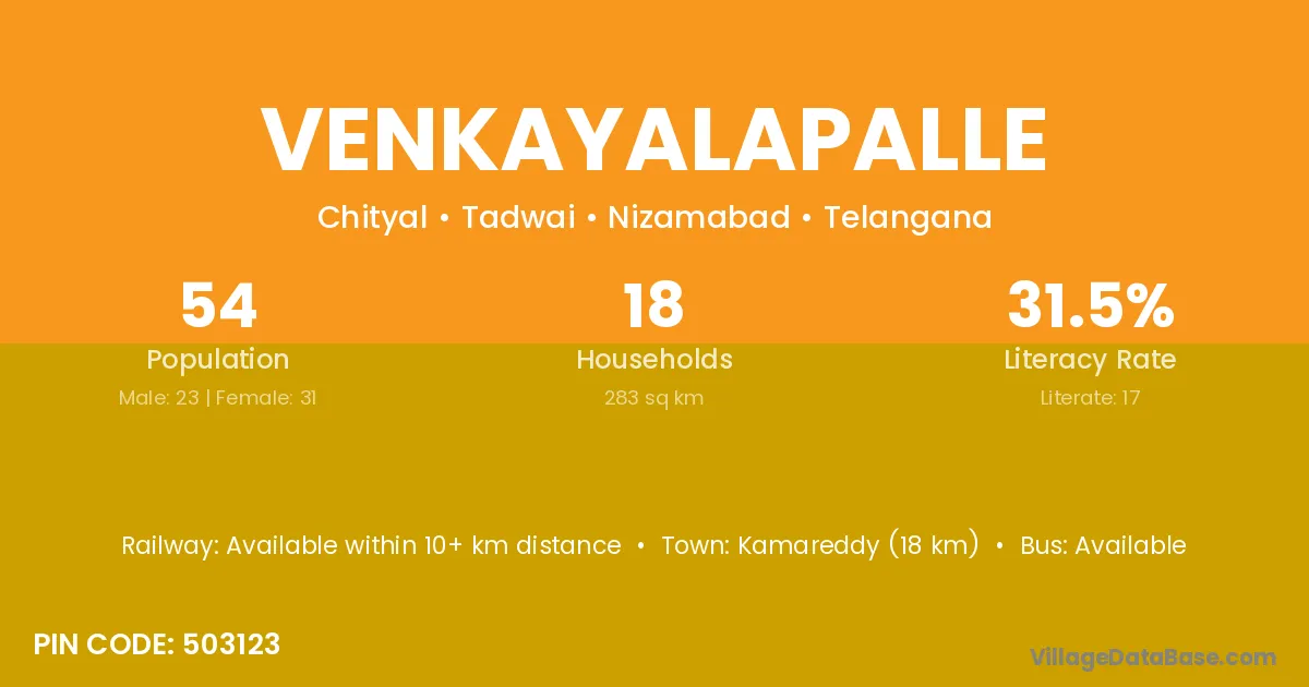Kamareddy (18 km) is the nearest town to Venkayalapalle village for major economic activities and is located approximately 18 km away.