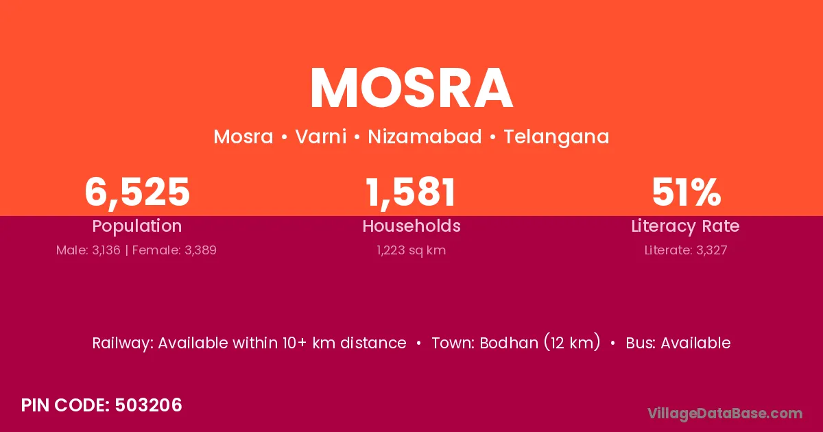 Bodhan (12 km) is the nearest town to Mosra village for major economic activities and is located approximately 12 km away.