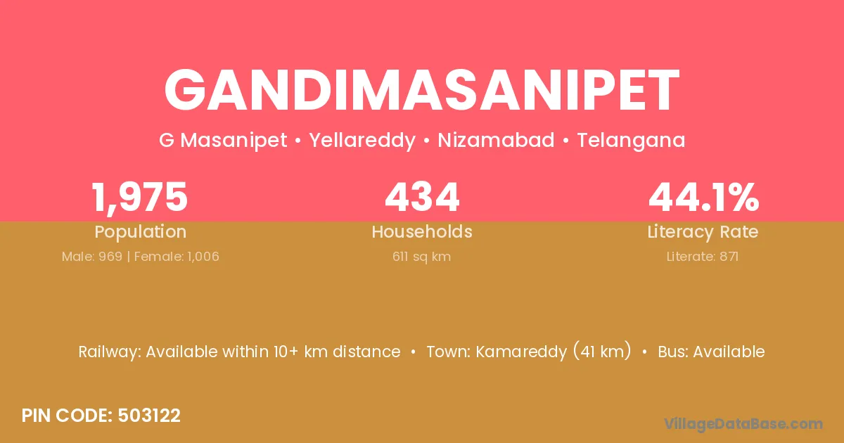 Kamareddy (41 km) is the nearest town to Gandimasanipet village for major economic activities and is located approximately 41 km away.