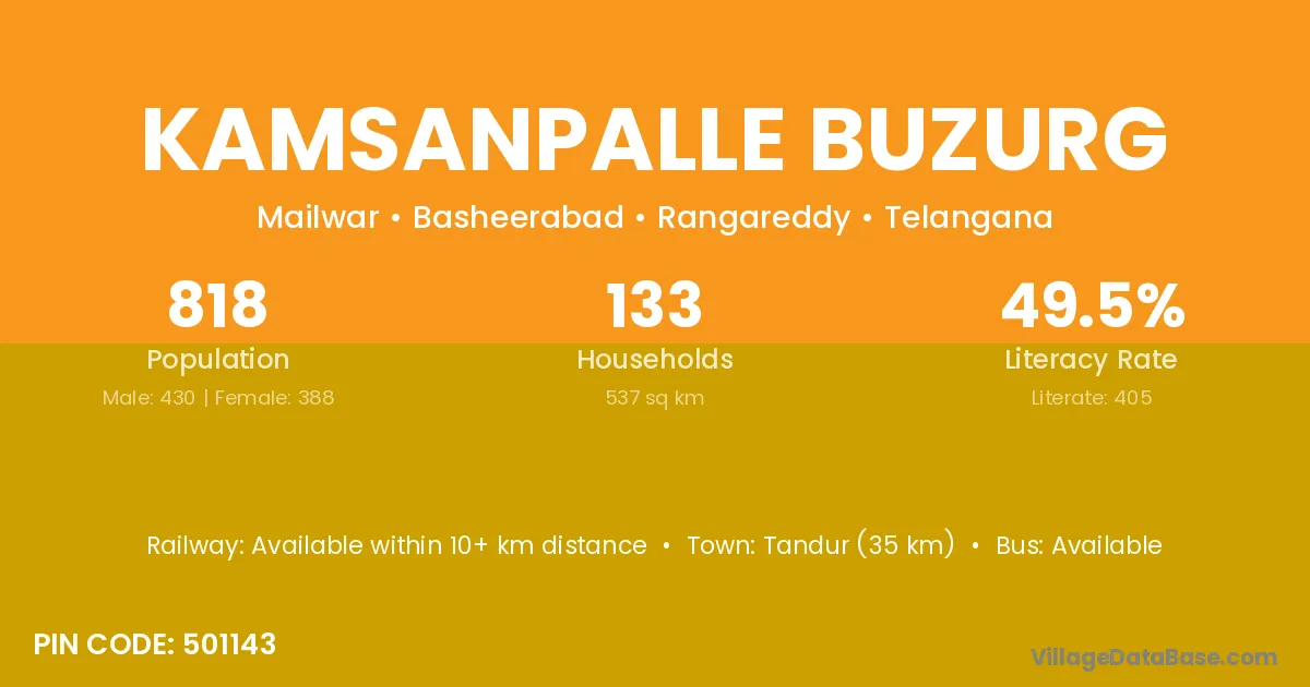 Tandur (35 km) is the nearest town to Kamsanpalle Buzurg village for major economic activities and is located approximately 35 km away.