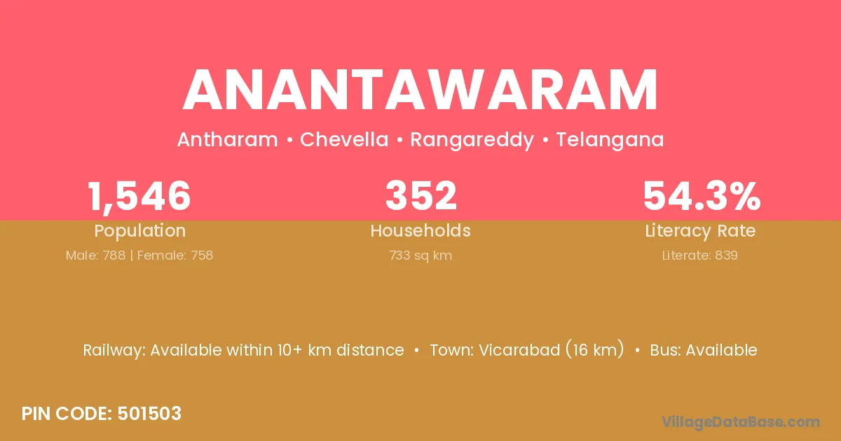 Vicarabad (16 km) is the nearest town to Anantawaram village for major economic activities and is located approximately 16 km away.