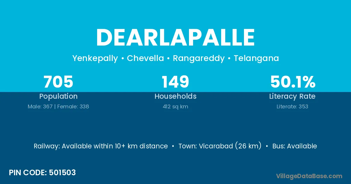 Vicarabad (26 km) is the nearest town to Dearlapalle village for major economic activities and is located approximately 26 km away.