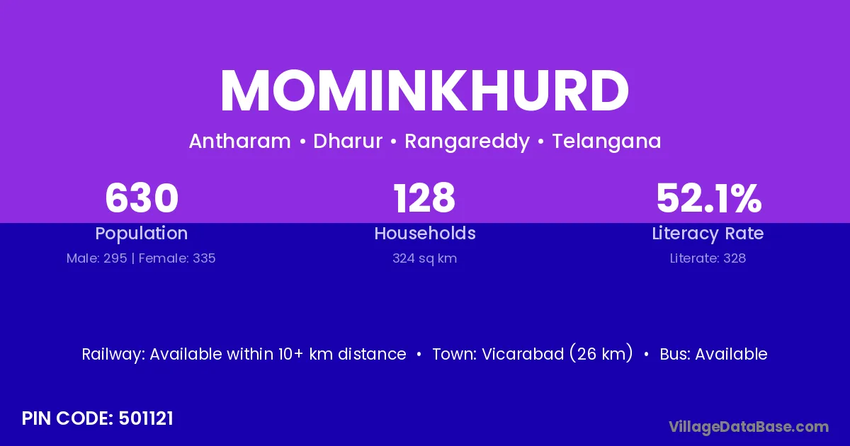 Vicarabad (26 km) is the nearest town to Mominkhurd village for major economic activities and is located approximately 26 km away.