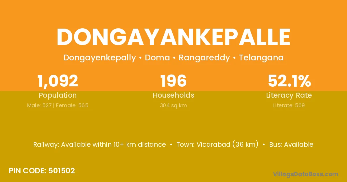 Vicarabad (36 km) is the nearest town to Dongayankepalle village for major economic activities and is located approximately 36 km away.