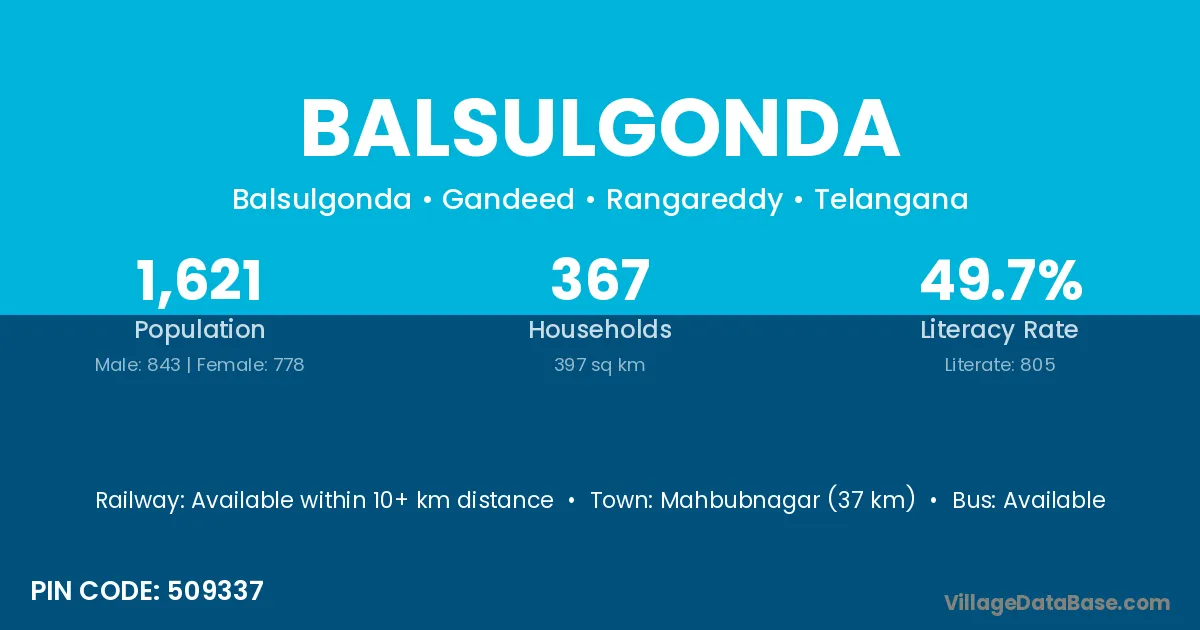 Mahbubnagar (37 km) is the nearest town to Balsulgonda village for major economic activities and is located approximately 37 km away.