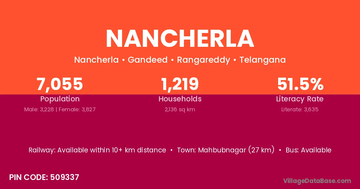 Mahbubnagar (27 km) is the nearest town to Nancherla village for major economic activities and is located approximately 27 km away.