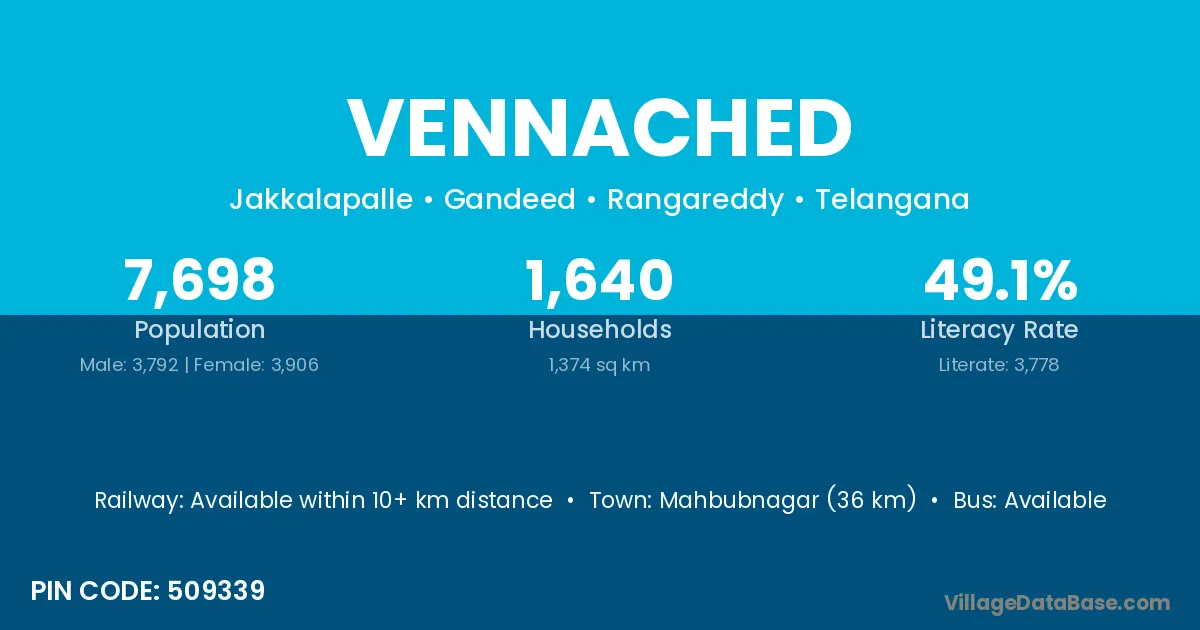 Mahbubnagar (36 km) is the nearest town to Vennached village for major economic activities and is located approximately 36 km away.