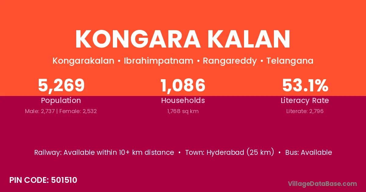 Hyderabad (25 km) is the nearest town to Kongara Kalan village for major economic activities and is located approximately 25 km away.