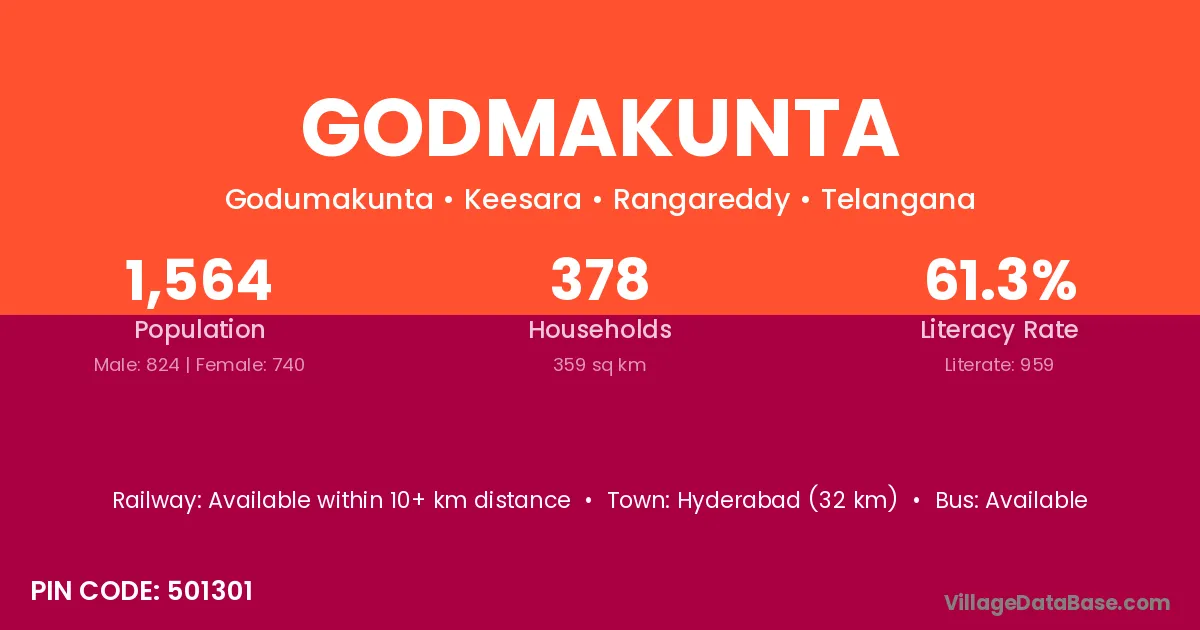 Hyderabad (32 km) is the nearest town to Godmakunta village for major economic activities and is located approximately 32 km away.