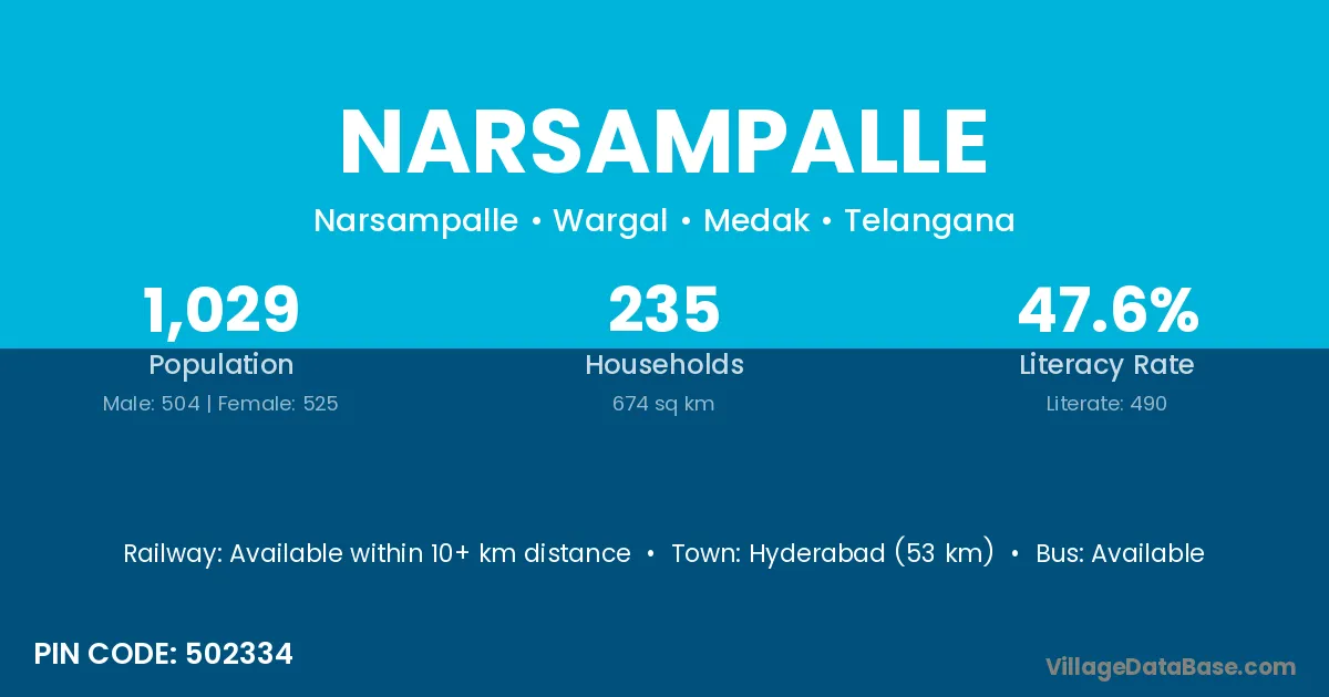 Hyderabad (30 km) is the nearest town to Narsampalle village for major economic activities and is located approximately 30 km away.