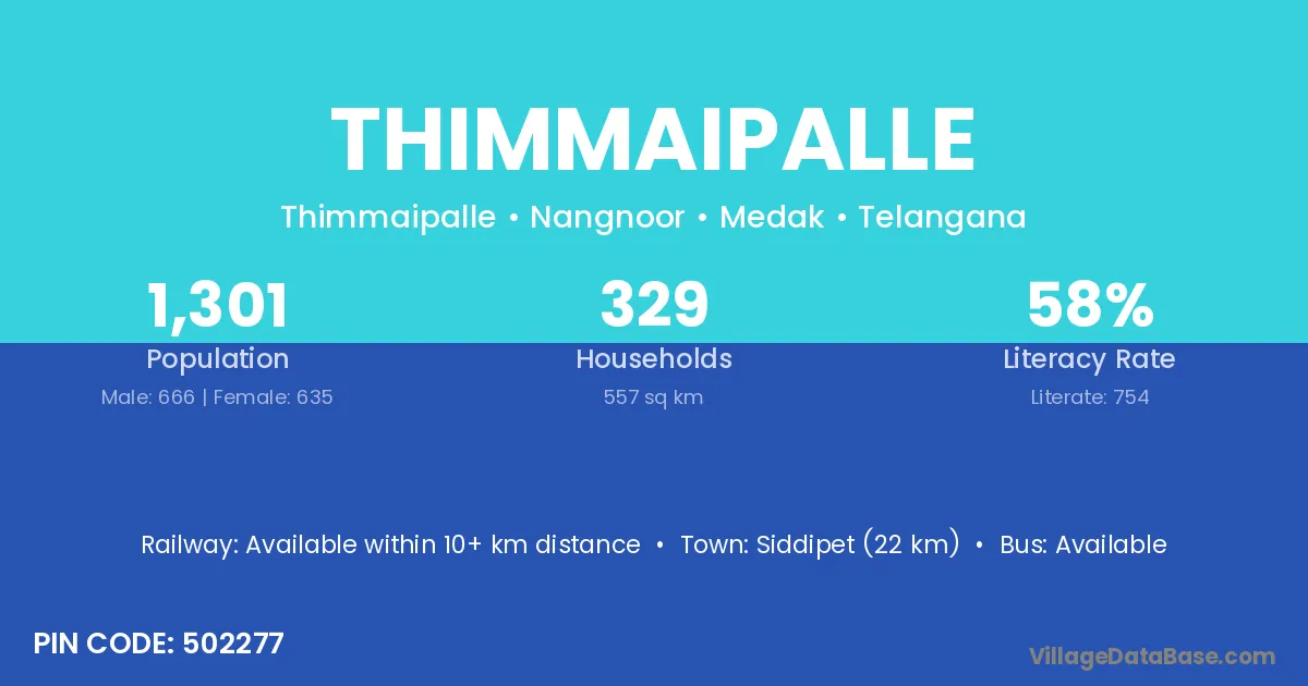 Hyderabad (29 km) is the nearest town to Thimmaipalle village for major economic activities and is located approximately 29 km away.