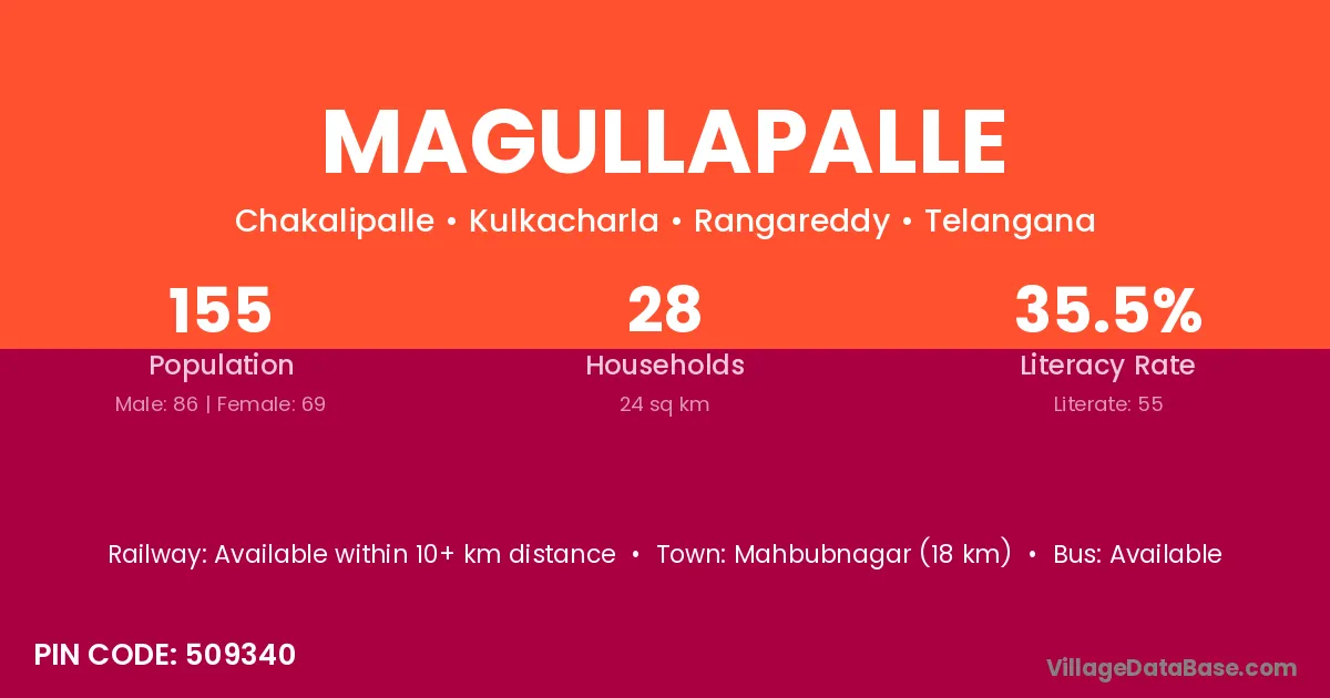 Mahbubnagar (18 km) is the nearest town to Magullapalle village for major economic activities and is located approximately 18 km away.