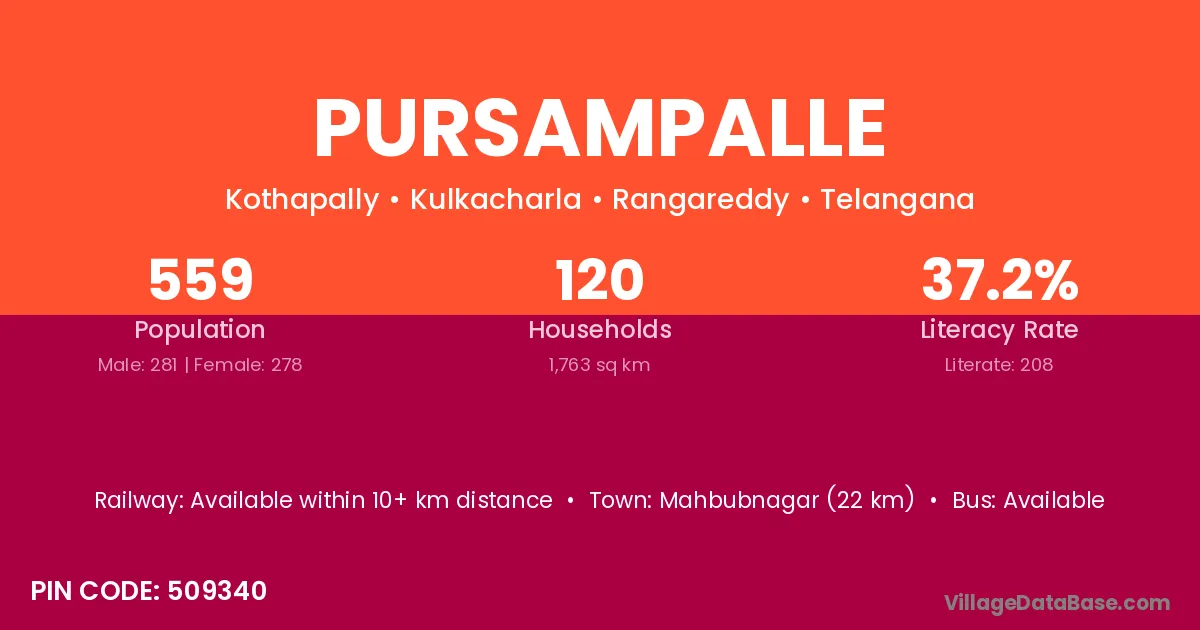 Mahbubnagar (22 km) is the nearest town to Pursampalle village for major economic activities and is located approximately 22 km away.