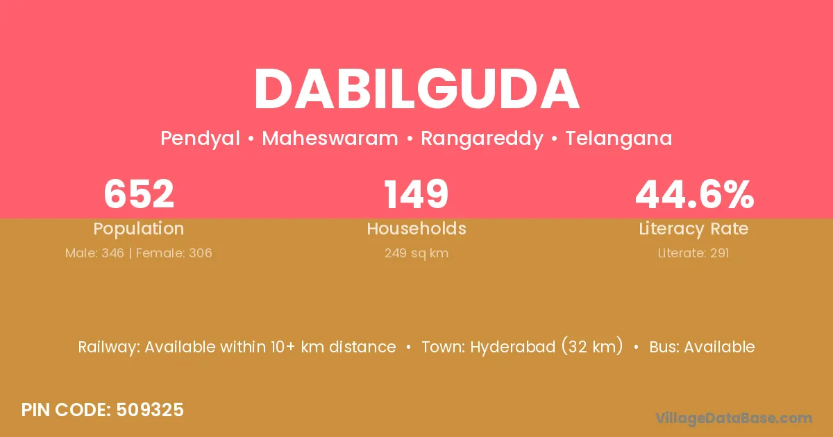 Hyderabad (32 km) is the nearest town to Dabilguda village for major economic activities and is located approximately 32 km away.