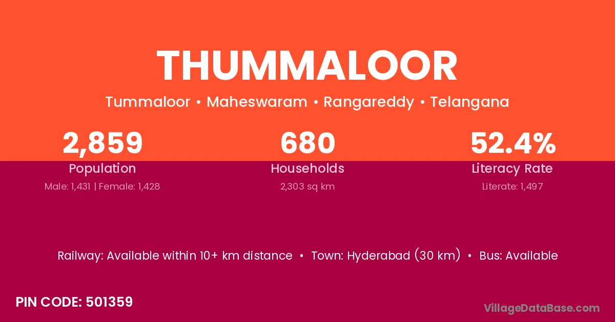 Hyderabad (30 km) is the nearest town to Thummaloor village for major economic activities and is located approximately 30 km away.