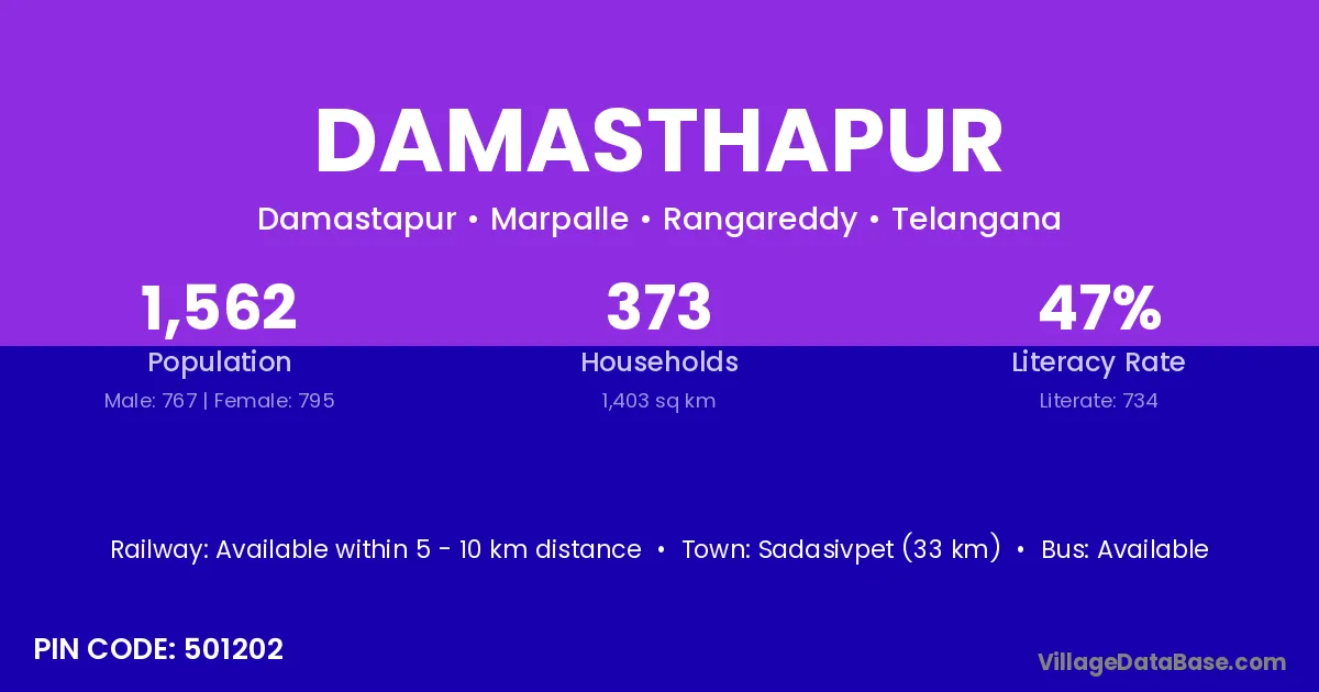 Sadasivpet (33 km) is the nearest town to Damasthapur village for major economic activities and is located approximately 33 km away.