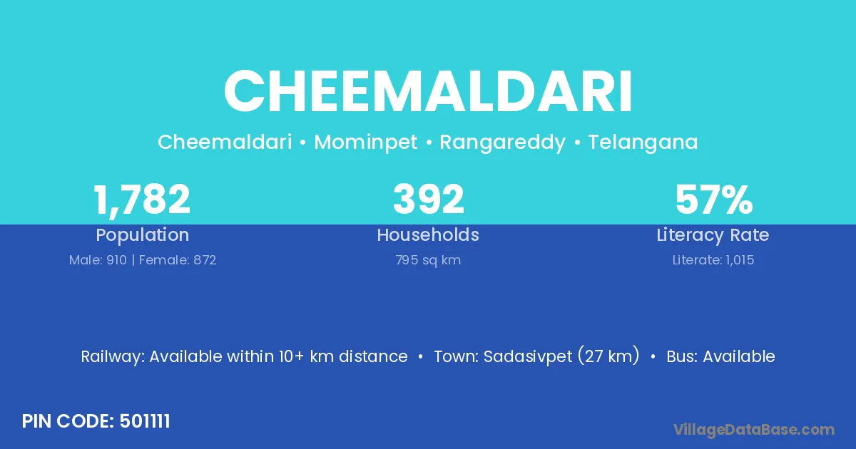 Sadasivpet (27 km) is the nearest town to Cheemaldari village for major economic activities and is located approximately 27 km away.