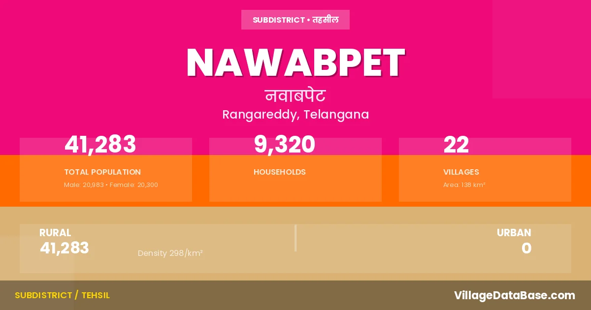 According to the 2011 census The total area of Nawabpet Mandal is 138 km², with a population of 41283 people. The population density is 298 inhabitants per square kilometre, and there are approximately 9320 houses in the sub district.