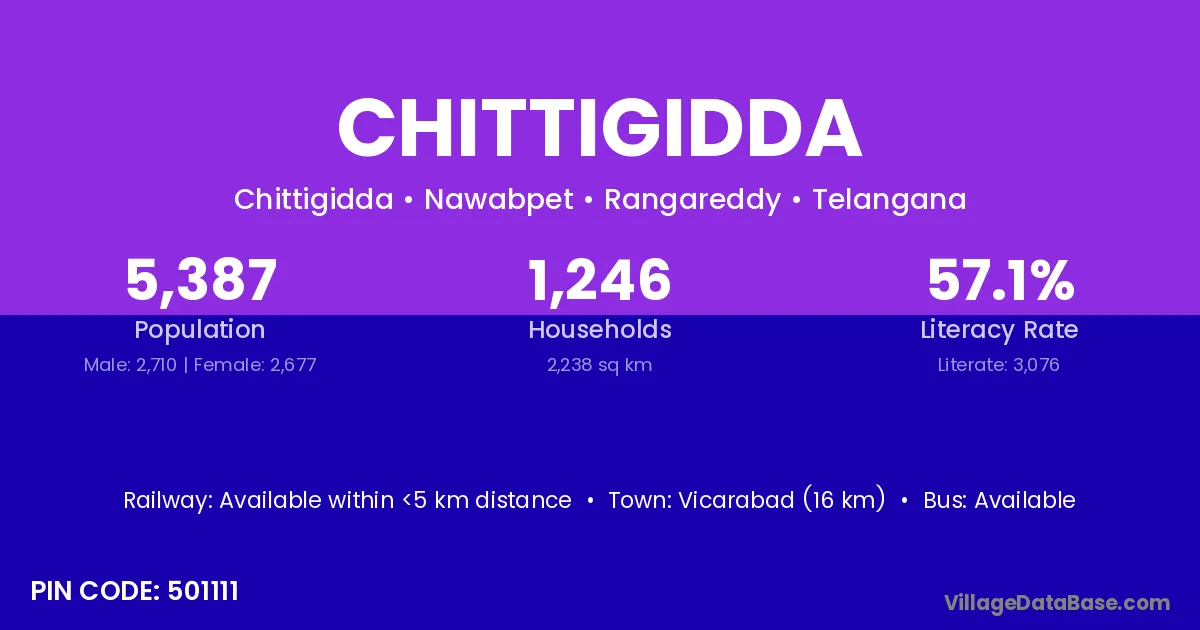 Vicarabad (16 km) is the nearest town to Chittigidda village for major economic activities and is located approximately 16 km away.