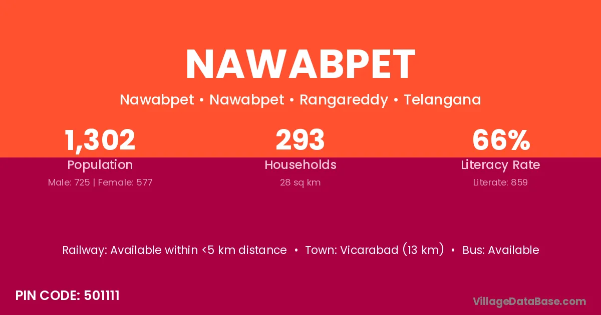 Vicarabad (13 km) is the nearest town to Nawabpet village for major economic activities and is located approximately 13 km away.
