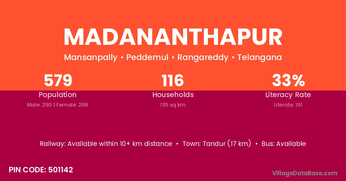 Tandur (17 km) is the nearest town to Madananthapur village for major economic activities and is located approximately 17 km away.
