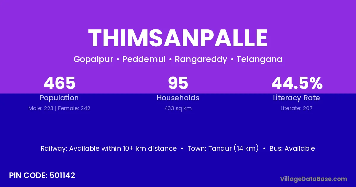 Tandur (14 km) is the nearest town to Thimsanpalle village for major economic activities and is located approximately 14 km away.
