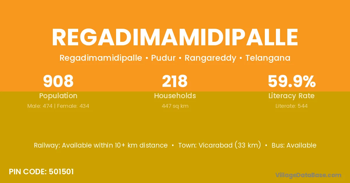 Vicarabad (33 km) is the nearest town to Regadimamidipalle village for major economic activities and is located approximately 33 km away.