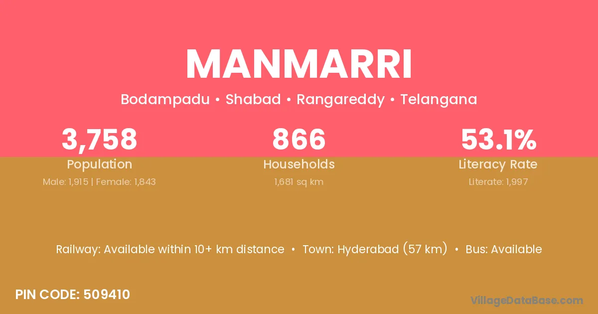 Hyderabad (57 km) is the nearest town to Manmarri village for major economic activities and is located approximately 57 km away.