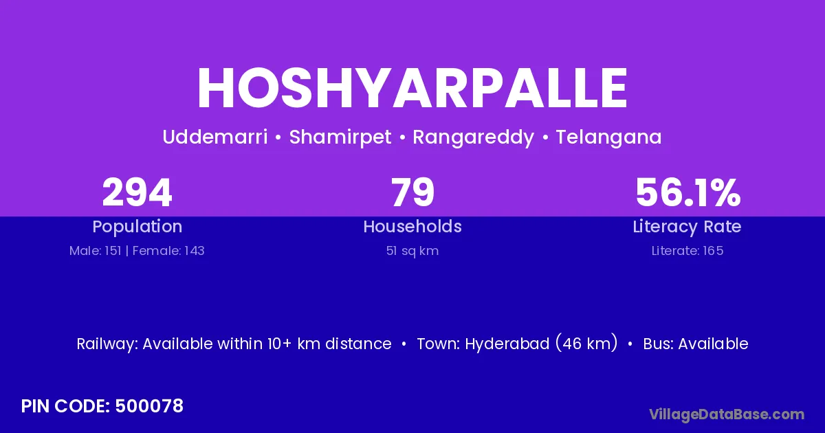 Hyderabad (46 km) is the nearest town to Hoshyarpalle village for major economic activities and is located approximately 46 km away.