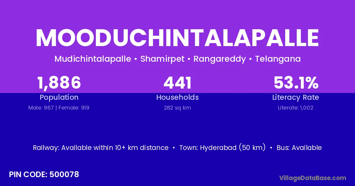 Hyderabad (50 km) is the nearest town to Mooduchintalapalle village for major economic activities and is located approximately 50 km away.