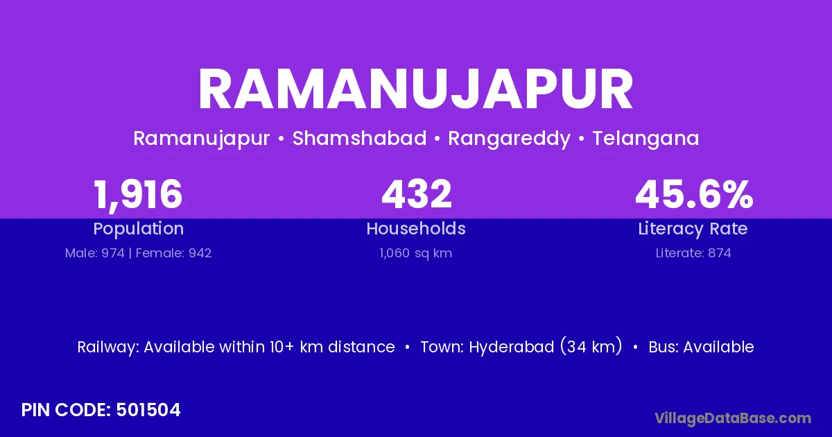 Hyderabad (34 km) is the nearest town to Ramanujapur village for major economic activities and is located approximately 34 km away.