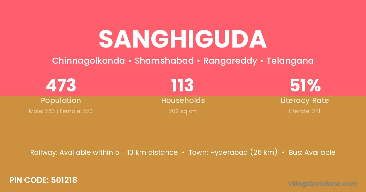 Hyderabad (26 km) is the nearest town to Sanghiguda village for major economic activities and is located approximately 26 km away.
