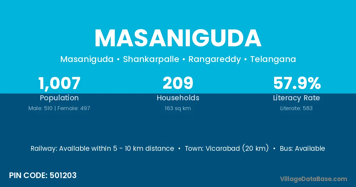 Vicarabad (20 km) is the nearest town to Masaniguda village for major economic activities and is located approximately 20 km away.