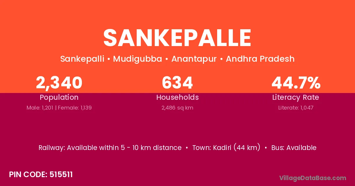 Vicarabad (22 km) is the nearest town to Sankepalle village for major economic activities and is located approximately 22 km away.