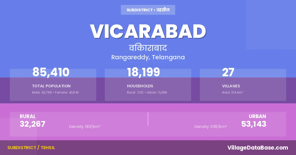 According to the 2011 census The total area of Vicarabad Mandal is 214 km², with a population of 85410 people. The population density is 399 inhabitants per square kilometre, and there are approximately 18199 houses in the sub district.