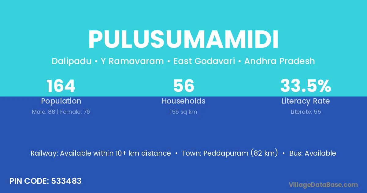 The literacy rate of Pulusumamidi village is 61.44%. Male literacy stands at 74.09% and female literacy at 48.28%.