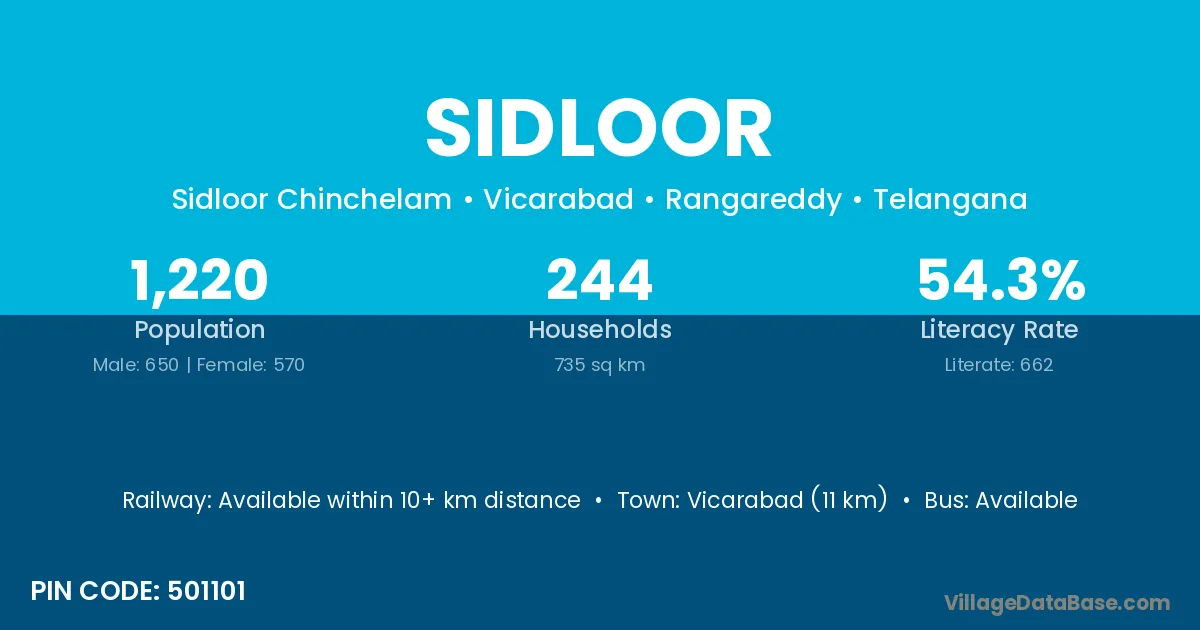 Vicarabad (11 km) is the nearest town to Sidloor village for major economic activities and is located approximately 11 km away.