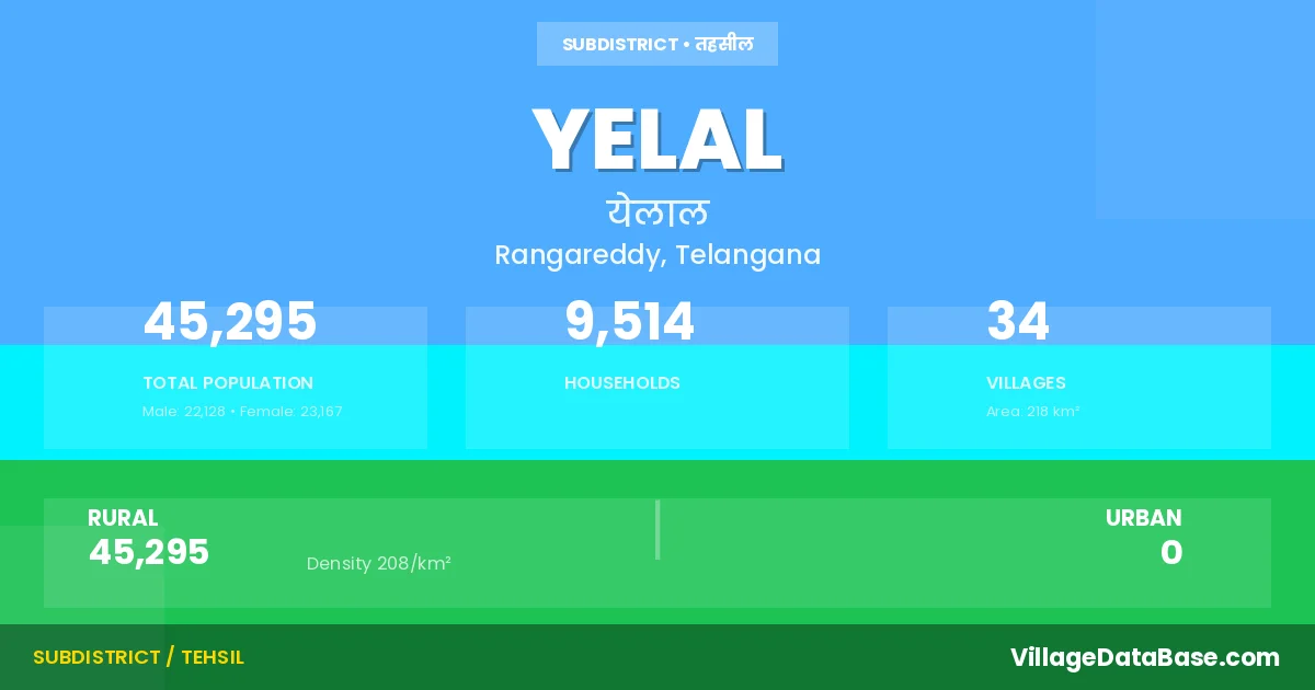 According to the 2011 census The total area of Yelal Mandal is 218 km², with a population of 45295 people. The population density is 208 inhabitants per square kilometre, and there are approximately 9514 houses in the sub district.
