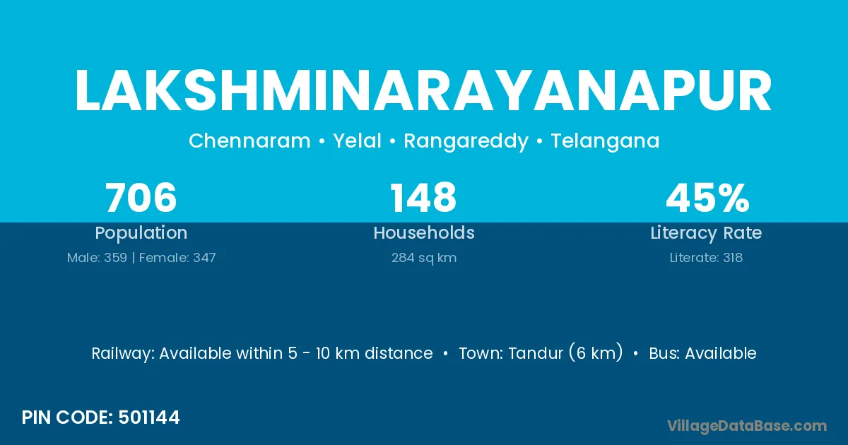 Lakshminarayanapur village has a total population of 706 people, of which 359 are males and 347 are females.