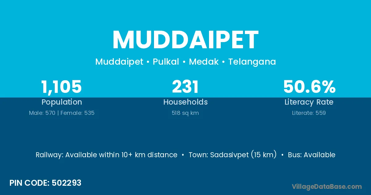 Vicarabad (18 km) is the nearest town to Muddaipet village for major economic activities and is located approximately 18 km away.